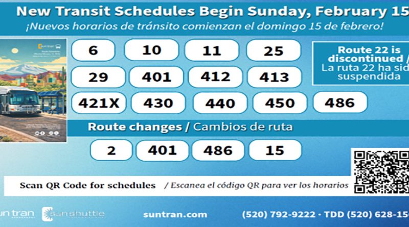 Read MoreTransit Service Changes Coming February 15 Mark your calendars, transit riders! Starting Sunday, February 15, Sun Tran and Sun Shuttle are